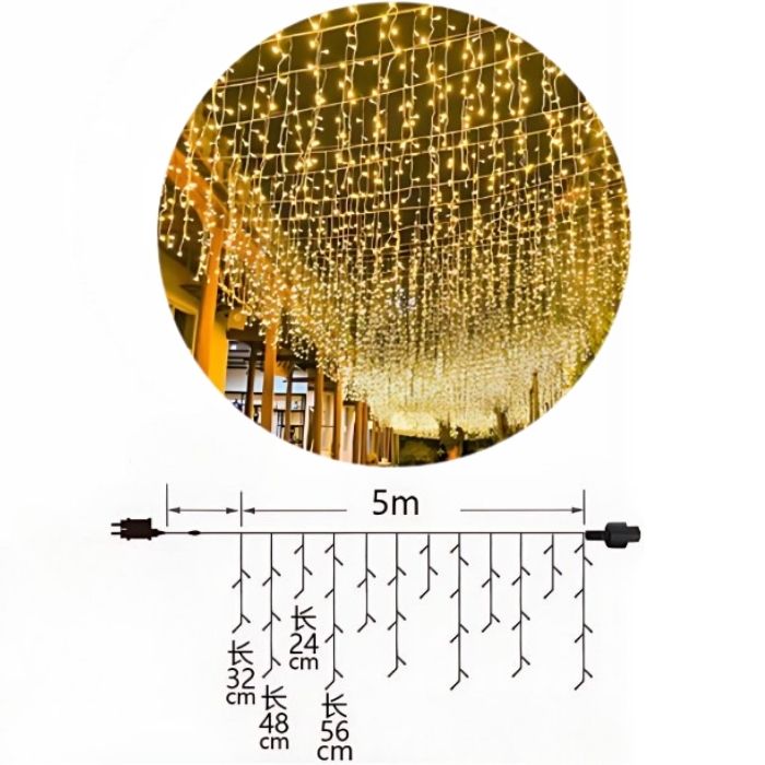 Με μήκος 5 μέτρων και σχεδιασμό τύπου βροχής, φωτίζουν αρμονικά κάθε παράθυρο, μπαλκόνι, τοίχο ή κήπο, χαρίζοντας μια αίσθηση ζεστασιάς και εορταστικής λάμψης.