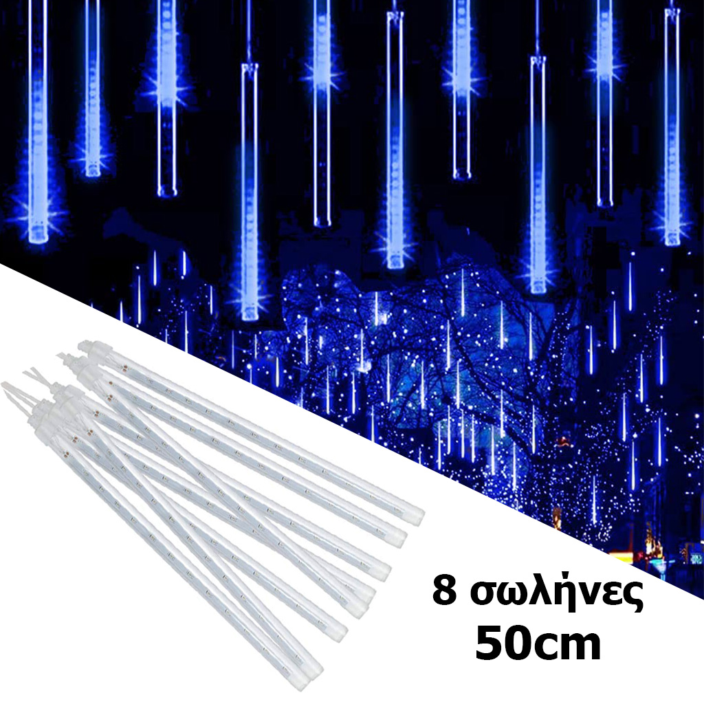 3μ Χριστουγεννιάτικη LED Βροχή Μετεωριτών 8τμχ x 50cm Μπλε Φωτισμός - Σταγόνες Σταλακτίτες Επεκτεινόμενη