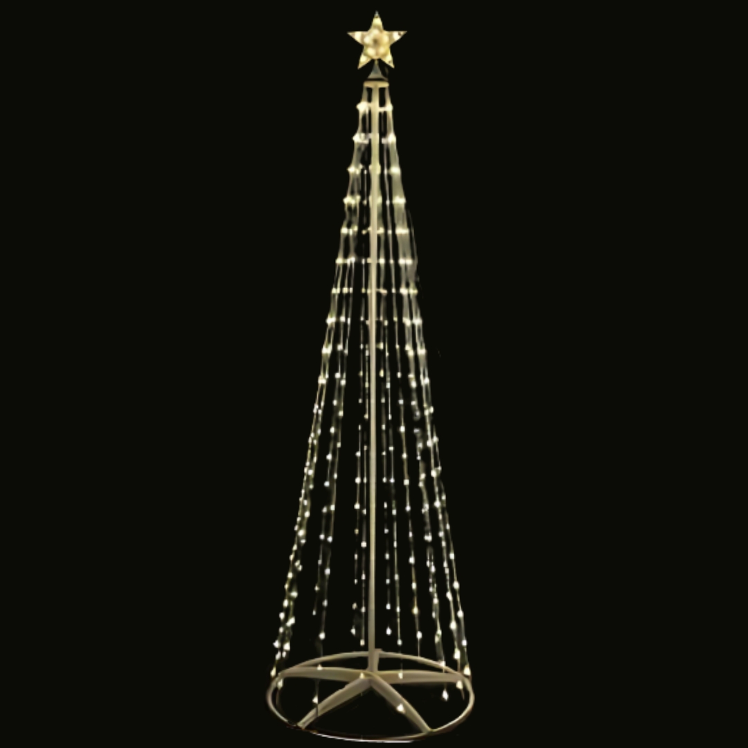 Οι λεπτές σειρές από λαμπάκια σχηματίζουν ένα φωτεινό κώνο με κορυφή το χρυσό αστέρι, δημιουργώντας μια μινιμαλιστική αλλά παράλληλα εντυπωσιακή διακόσμηση.