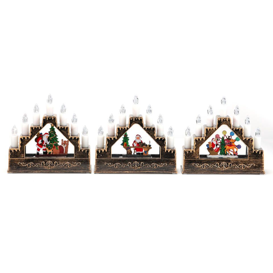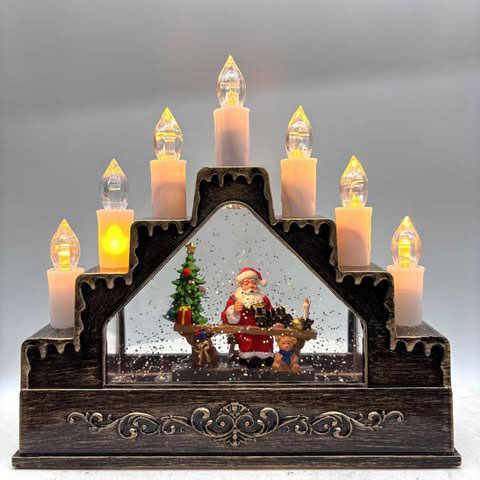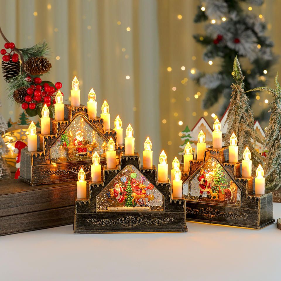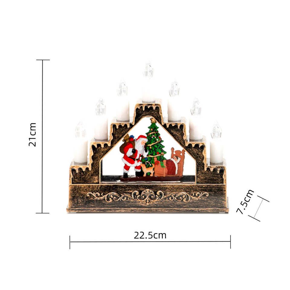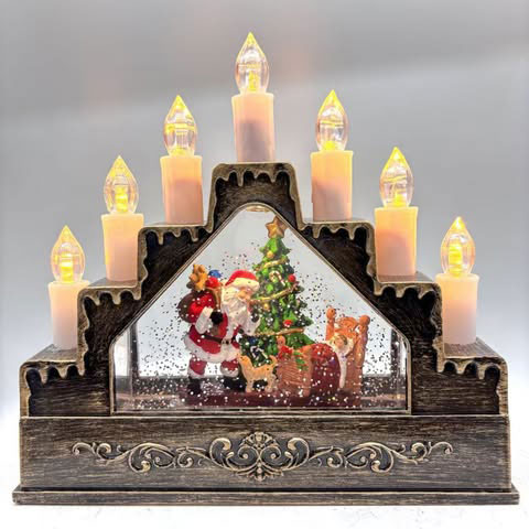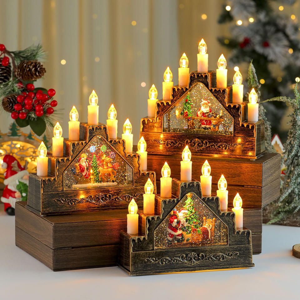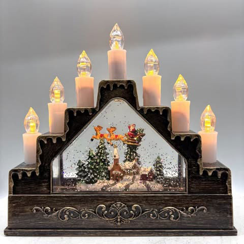 Στο κέντρο κάθε επιπέδου υπάρχει φωτιζόμενο “παράθυρο” με χριστουγεννιάτικη σκηνή: τον Άγιο Βασίλη, το έλκηθρο, το χριστουγεννιάτικο δέντρο και λαμπερό χιόνι που κινείται όταν λειτουργεί. Οι LED “κερο-λαμπες” περιμετρικά δημιουργούν μια ζεστή χρυσαφένια λάμψη, φωτίζοντας το εσωτερικό και ενισχύοντας τη μαγεία της σύνθεσης.