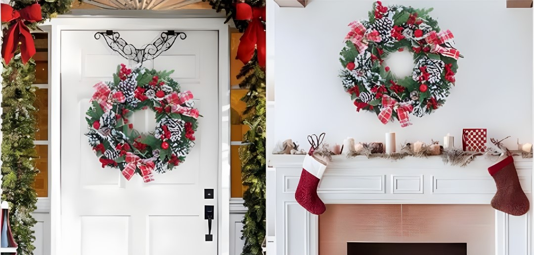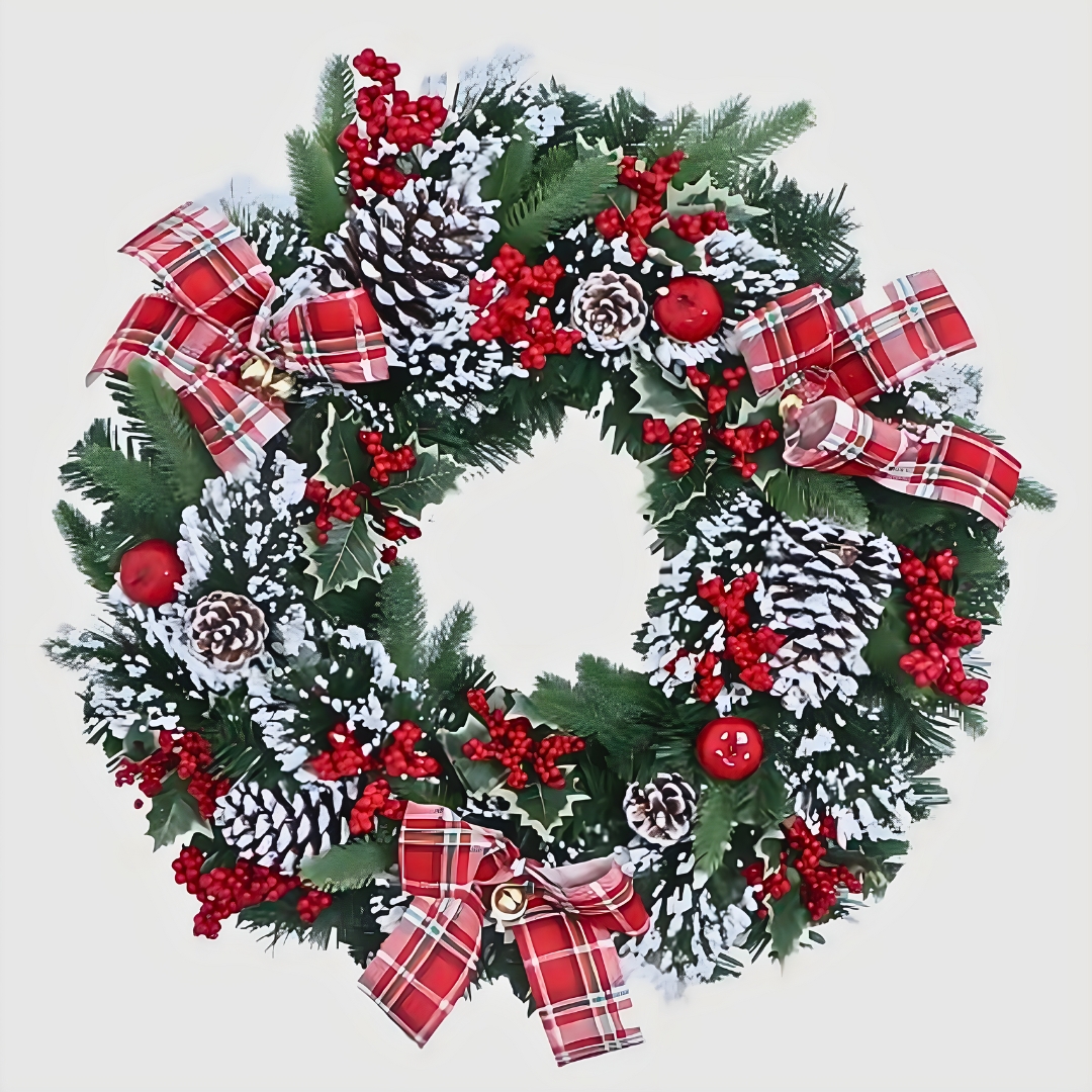 Οι πυκνές πράσινες βελόνες, τα λευκά “χιονισμένα” κουκουνάρια και οι κόκκινες πινελιές από ράγες και κορδέλες tartan δημιουργούν ένα απόλυτα γιορτινό σύνολο, ιδανικό για πόρτες, τζάκια ή τοίχους.