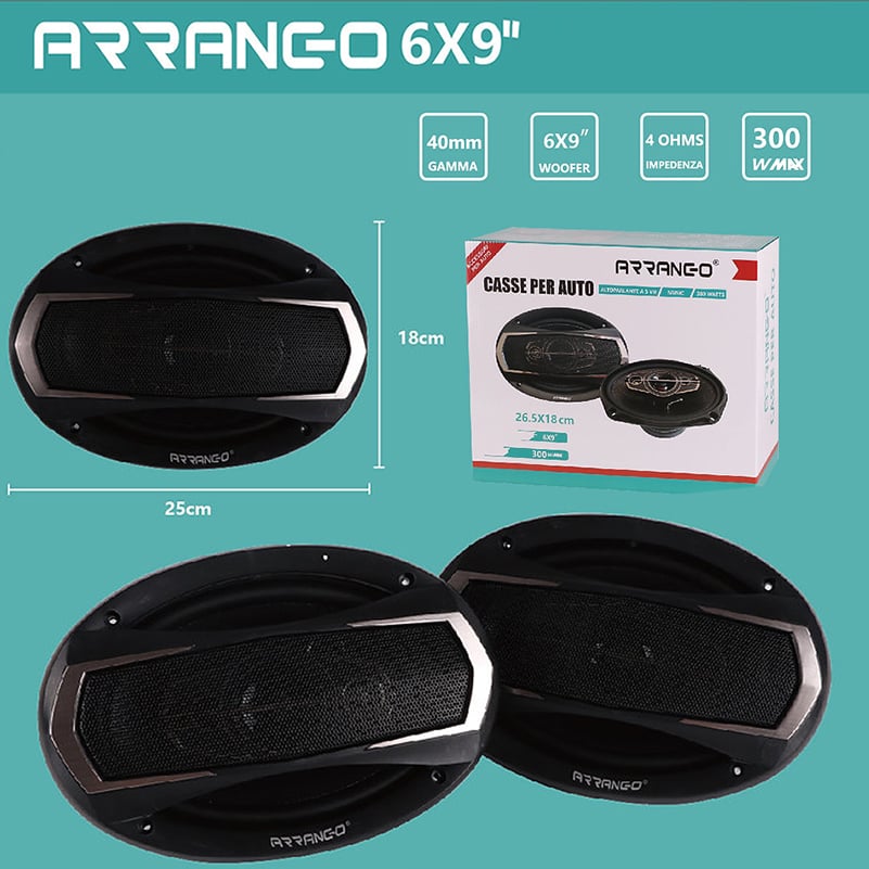 Ζεύγος ομοαξονικών ηχείων Oval της Arranco, 2 δρόμων 17x25cm ισχύος 300 Watt Max. Εξοπλισμένα με κωνικό Woofer 6x9" για πλούσια μπάσα και κωνικό Tweeter για καθαρές υψηλές νότες.